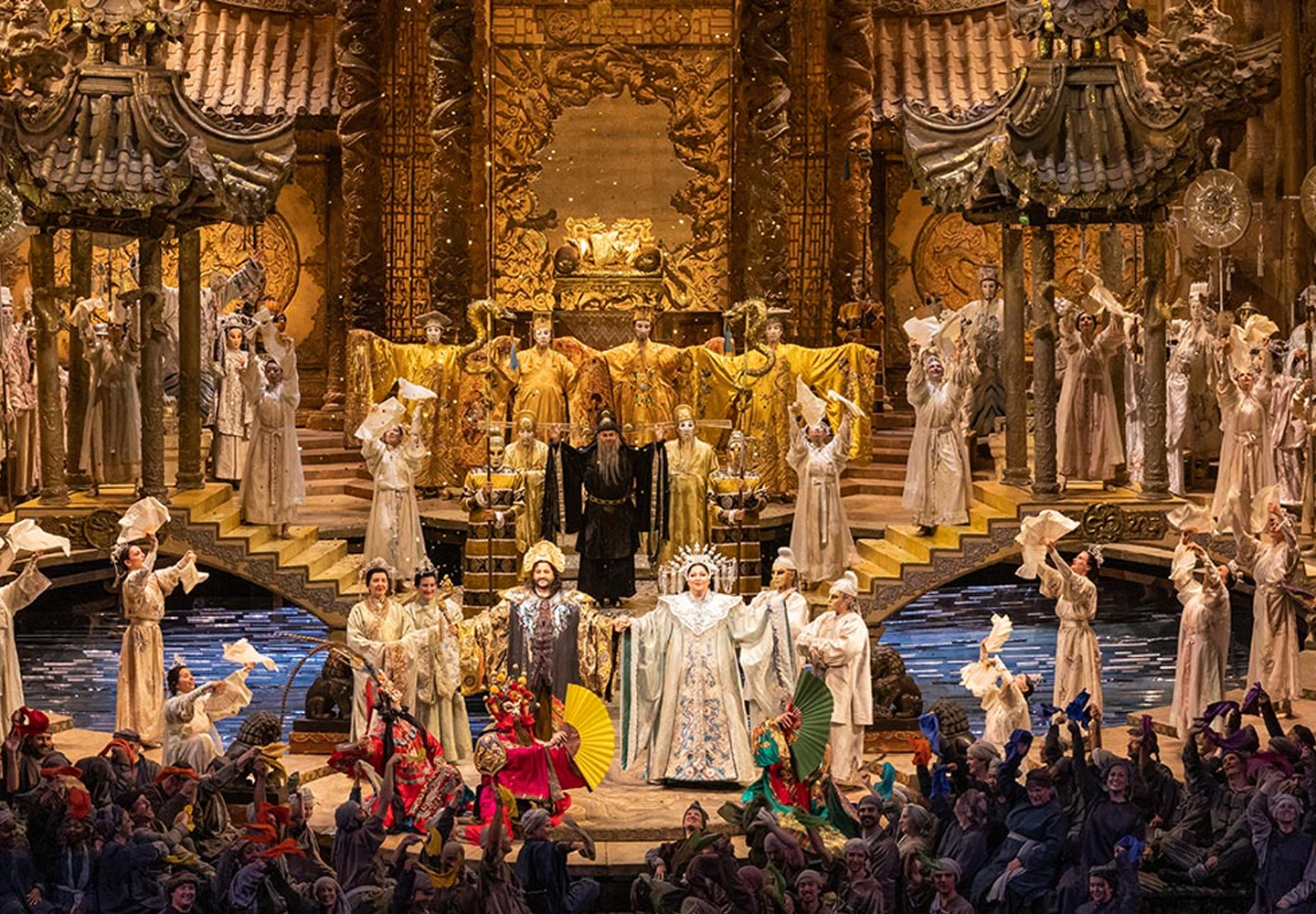 corte, Turandot afferma che sposerà lo straniero il cui nome è Amore. Sorge il sole e tutti festeggiano la nuova coppia