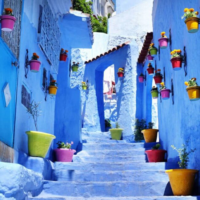 Prima colazione in hotel. Di buon mattino, partenza verso la spettacolare Chefchaouen, una delle città più belle del massiccio montuoso del Rif, chiamata la “Perla Blu del Marocco” è conosciuta per la sua Medina di vicoli ombrosi, case bianche con porte blu turchese, finestre in ferro battuto e tetti ricoperti di tegole. Pranzo in ristorante in corso di